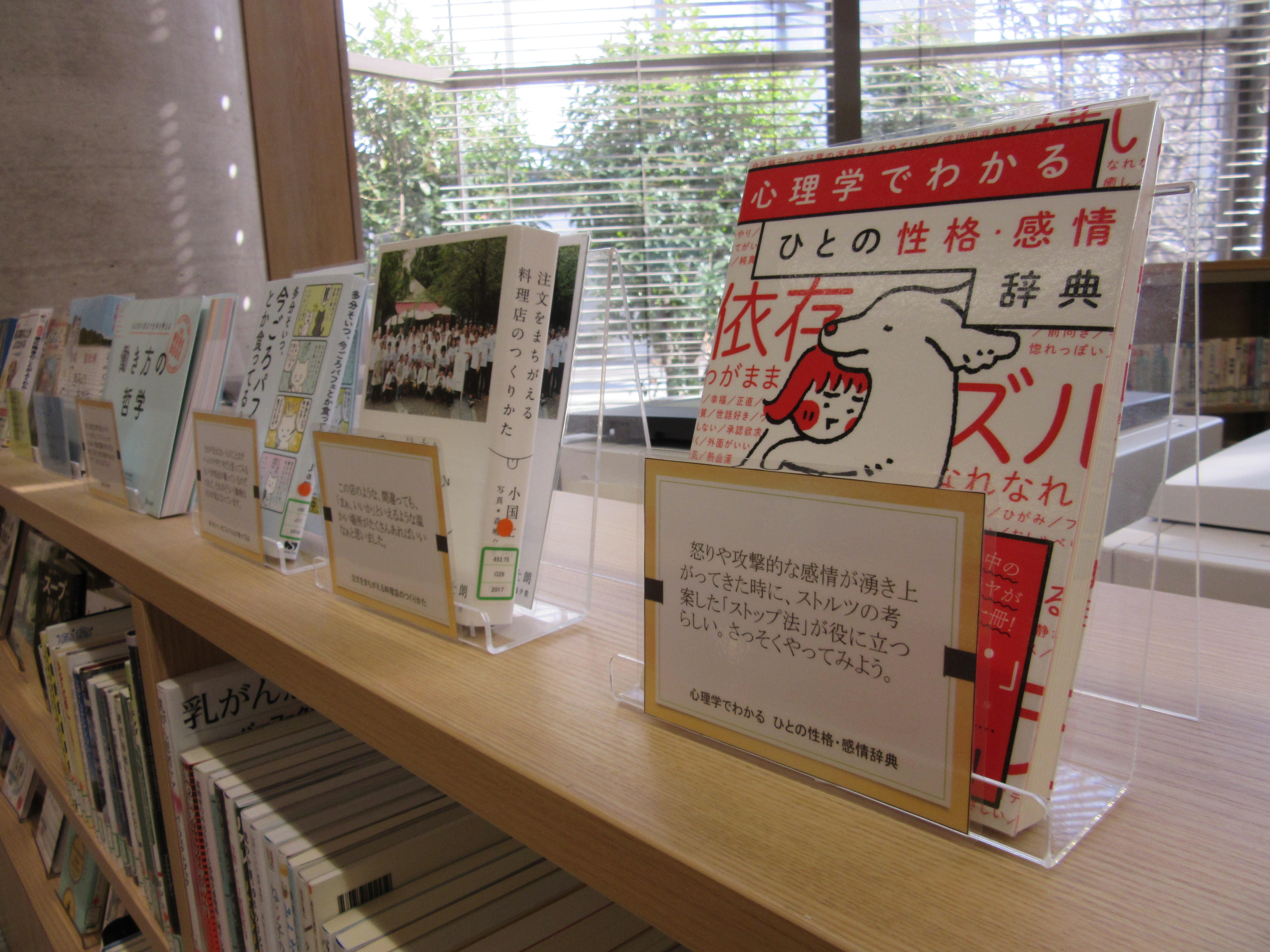 カウンター横にある展示コーナーで、参加者の皆様に作成していただいたポップと共に図書を展示しています。