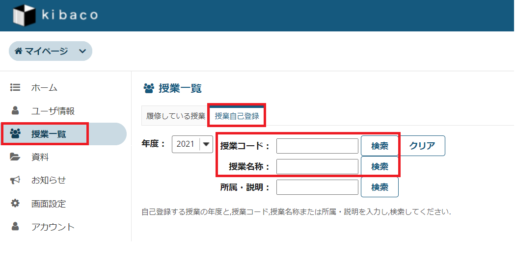 マイページの授業一覧で授業名を検索し、自己登録してください。