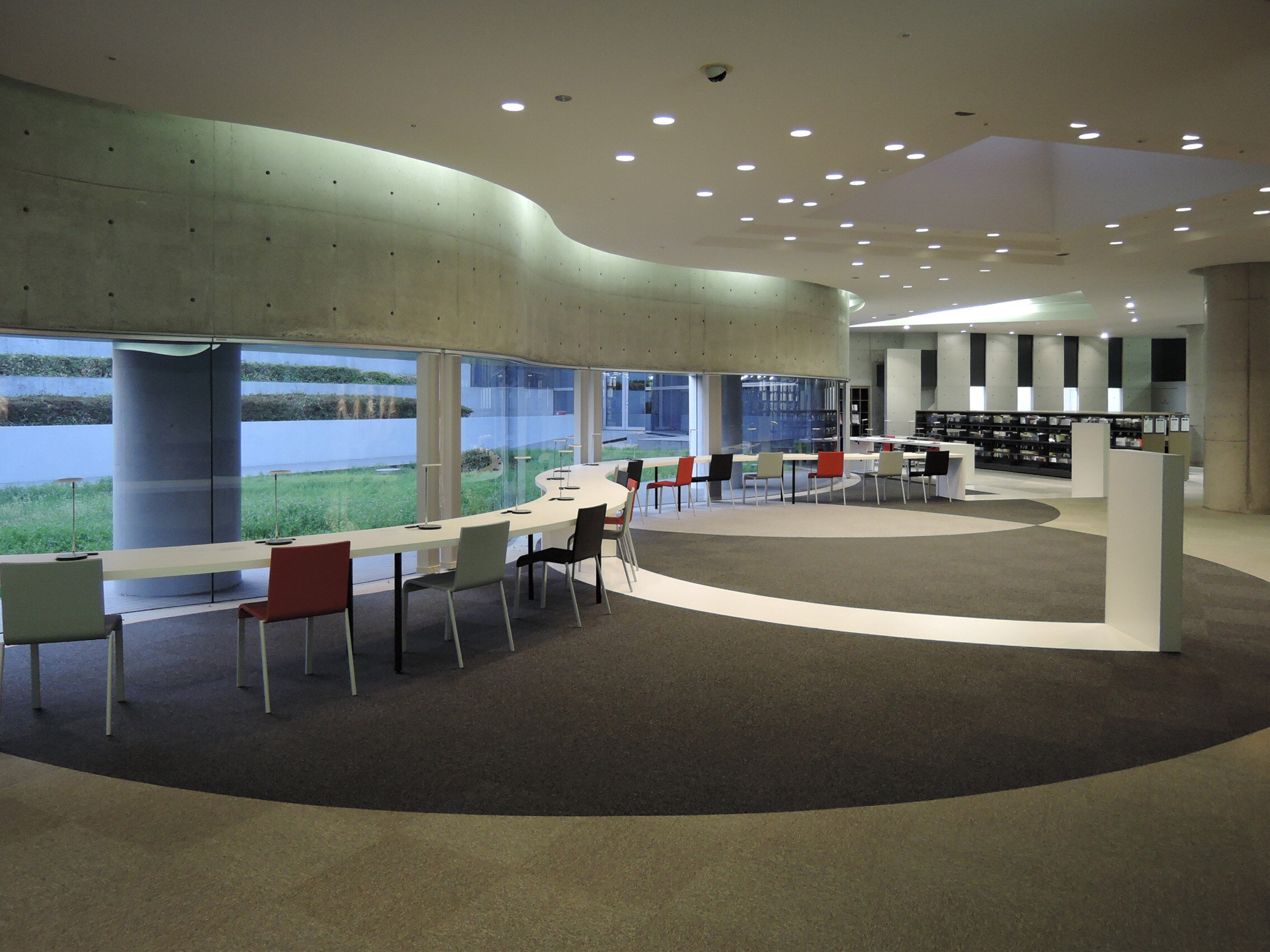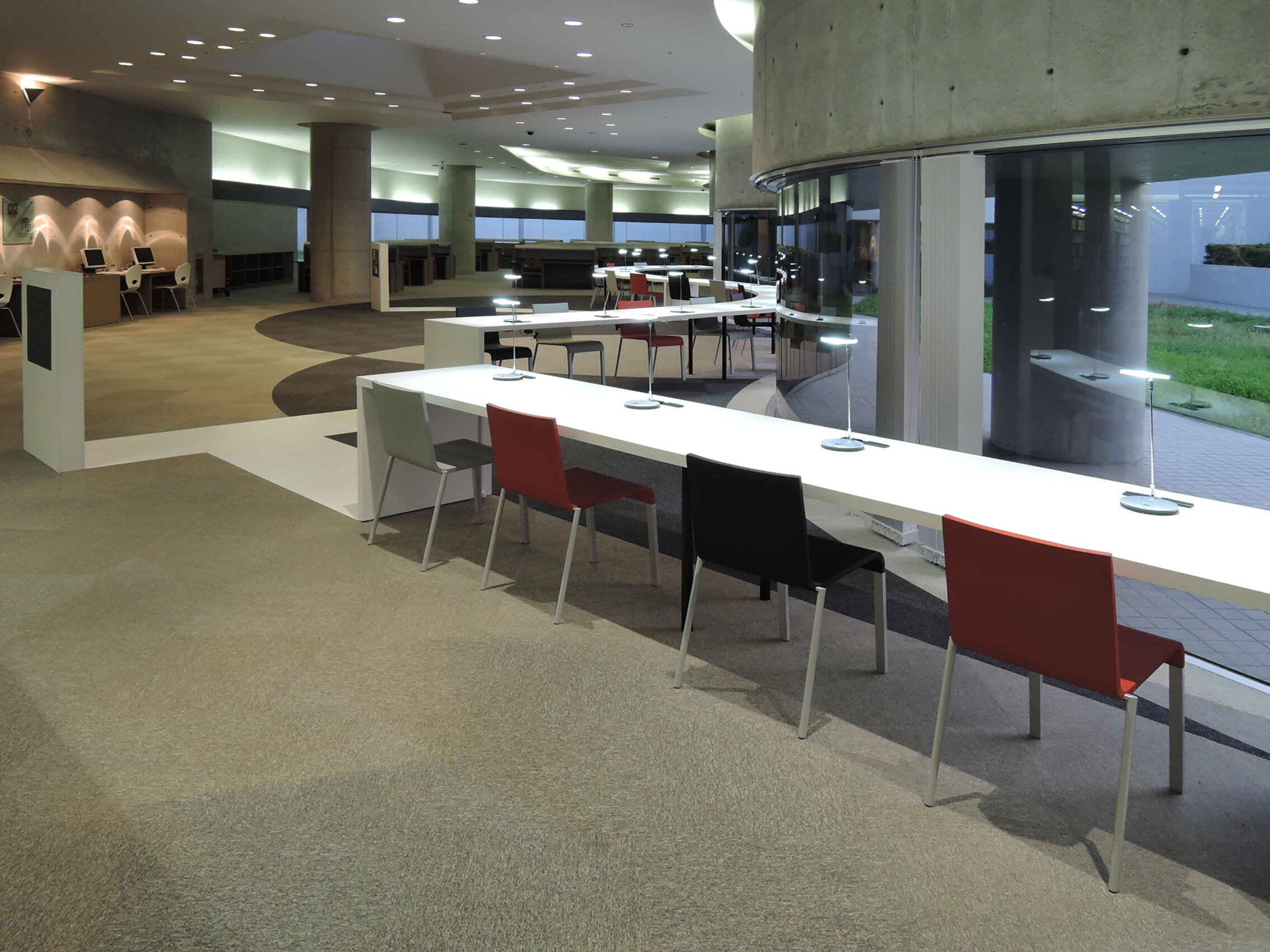 S字型閲覧席を増設しました 掲載日:2018年4月3日 日野館の波型の窓際に、S字型の閲覧席を増設しました。 窓辺に見える緑を前に、一人でゆっくりと時間を過ごせる作りになっています。お静かにご利用ください。 右側の閲覧席は、車椅子優先の閲覧席です。5cmほど高い作りになっています。