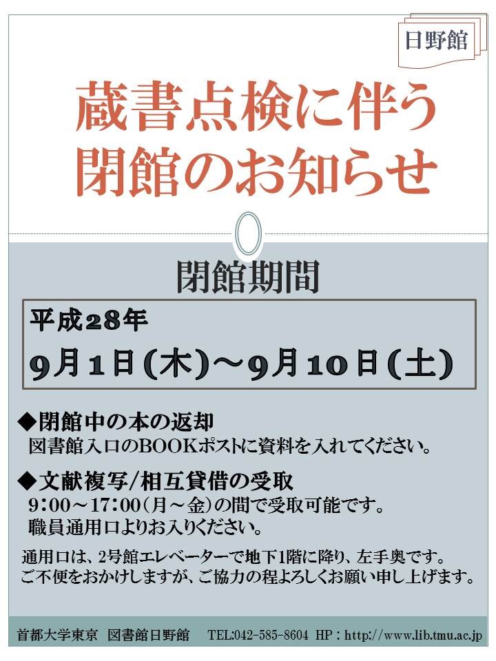 蔵書点検に伴う日野館閉館のお知らせ